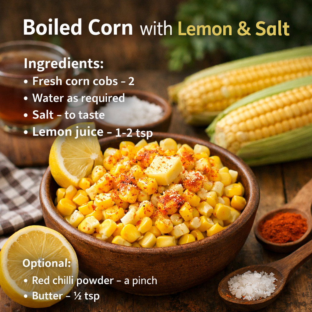 Corn is rich in dietary fiber, helps digestion, gives quick energy, and keeps you full for a longer time. Lemon adds a refreshing tang and Vitamin C, while salt enhances the natural sweetness of the corn. Ingredients simple idru taste extraordinary. Simple idru special feeling ಕೊಡುವ snack idu.