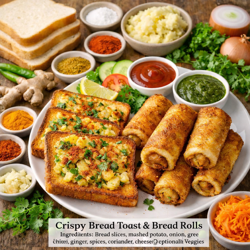 Bread Toast / Bread Roll are cherished Indian evening snacks loved by all generations. Tea-time bite ☕ ಆಗ ಬೇಕಾದಾಗ ಅಥವಾ rainy evening craving 🌧️ ಬಂದಾಗ, these snacks instantly comfort ಕೊಡುತ್ತವೆ. Easily accessible ingredients like bread, vegetables, and mild spices ಬಳಸಿ, these become both fulfilling and delightful.