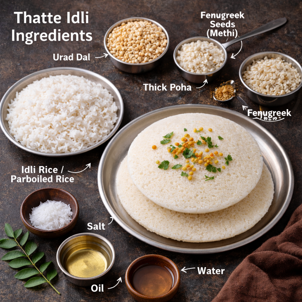 Thatte Idli, popularly known as Plate Idli, is a famous South Indian breakfast delicacy loved for its large size, spongy texture, and mild sourness. Unlike regular idlis, Thatte Idli is poured into flat plates( thattes), resulting in a thick, soft, and airy idli that absorbs chutney and sambar beautifully.